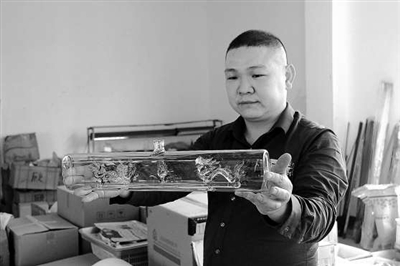 | 顾彬展示水晶拉丝工艺品。 |