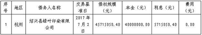 中国华融资产管理股份有限公司拥有绍兴县绿叶印染有限公司1笔不良债权,截至交易基准日,债权总额为45715050.40元,债权担保方式为抵押加保证。(具体材料可到中国华融网站www.chamc.com.cn查询)
