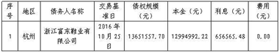 中国华融资产管理股份有限公司拥有浙江富东鞋业有限公司1笔不良债权,截至交易基准日,债权总额为13651557.70元,债权担保方式为抵押加保证。(具体材料可到中国华融网站www.chamc.com.cn查询)