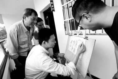 | 唐彰创作时常常引来工友围观。 |