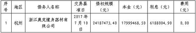 中国华融资产管理股份有限公司拥有浙江奥克健身器材有限公司1笔不良债权,截至交易基准日,债权总额为24187473.40元,债权担保方式为抵押加保证。(具体材料可到中国华融网站www.chamc.com.cn查询)