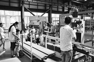 图为老师带着孩子们去车间参观父母工作的地方,体会父母工作的艰辛和不易。