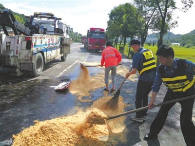 常山县公路管理局的芳村路政中队周明文中队长接到报警电话后,马上联系城北公路站的值班人员一起拉上木屑赶赴事故现场。路政人员紧急做好现场警示,与养护人员一同抓紧在油污的路面上铺设木屑。经过3个多小时的紧急铺设和清扫,终于把320国道路面上的油污全部处理完毕,消除了公路上的安全隐患。徐莹 陈云山