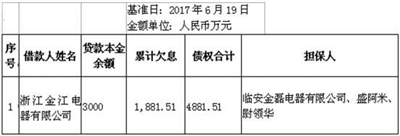 | 注:1. 清单中“担保人”包括保证人、抵押人、出质人,担保人的担保范围以签署的合同等法律文件约定为准。如公告中债务人、合同编号、债权金额、担保人等信息与事实不符的,以签署的合同等法律文件约定为准。 2. 本公告清单列示截至2017年6月19日的贷款本金余额,借款人和担保人应支付给浙江盈泉投资管理有限公司的利息、罚息、违约金及其它应付款按借款合同、担保合同及中国人民银行的有关规定或生效法律文书确定的方法计算,实际计算与欠息金额不一致,以实际计算为准。已经进入诉讼程序的,并已由浙江盈泉投资管理有限公司垫付的应由借款人及担保人负担的诉讼费、执行费等以有关法律文书确定的金额为准。 3. 若借款人、担保人因各种原因更名、改制、歇业、吊销营业执照或丧失民事主体资格的,请相关承债主体及/或主管部门代位履行义务或履行清算责任。 |