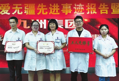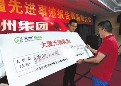 本报讯 记者周金友 通讯员裘燕云摄影报道 昨天下午,在杭州召开的表彰杭州九洲全诺大药房古墩路店职工临危不惧、积极营救受伤群众英勇行为大会上,杭州市拱墅区总工会授予该店拱墅区“工人先锋号”称号;授予带头组织救援伤者的店长吴杰拱墅区“创业先锋”称号。杭州九洲全诺大药房现场奖励该店参与救援的5位职工10万元现金。