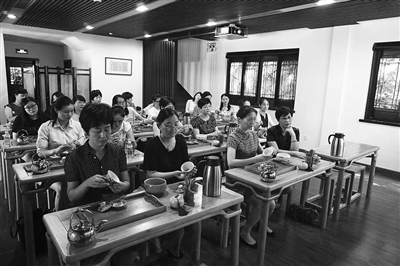 清清一盏茶,幽幽一缕香。职工们在博物馆内学习基本茶道,由专业讲师讲授盖碗茶的历史渊源、饮用方法、民俗文化等内容。随后,新晋“学员们”纷纷进行冲泡茶水体验,轻轻拿起木勺,舀上茶叶放进盖碗,再提起水壶,将烧开的水缓缓淋入茶杯,水蒸气携带着茶香袅袅上升。大家互相敬茶,互道一声“辛苦”。