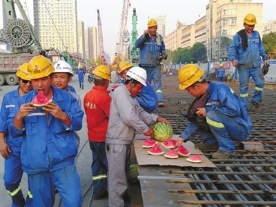 昨天傍晚,杭州地铁5号线一期工程SG5-16标江晖路站项目建设工地,一片火热景象。避开白天高温时段施工的浙江大成建设集团的工人师傅,汗流浃背时,一声吃西瓜了,让工人们瞬间感觉清凉来了。
