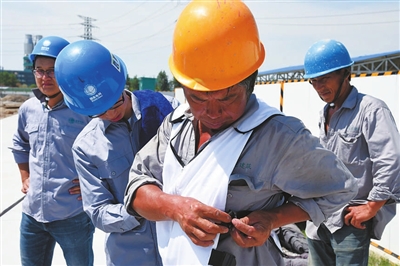 近日,上虞杭州湾工业园区的江滨500千伏变电站内,顶着骄阳的工人师傅们身着的银白色小背心格外引人注目,这件小背心是师傅们战高温的“秘密武器”。
