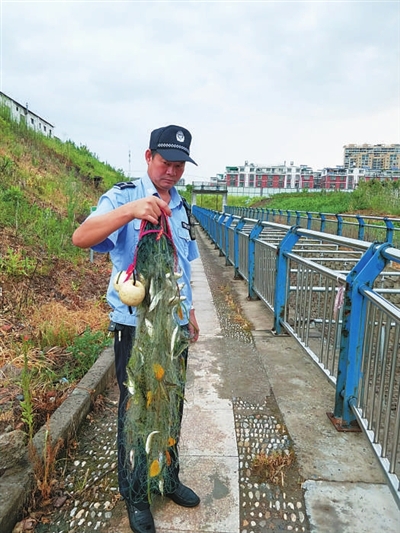 徐志强等执法人员沿阳光大道来到义乌江下骆宅段,发现有人正在义乌江浅滩处用丝网捕鱼,捕鱼人员见到执法人员到来,丢下丝网逃离现场,执法人员当场对丝网进行查扣,那些被丝网网住的鱼多数已死亡(下图)。