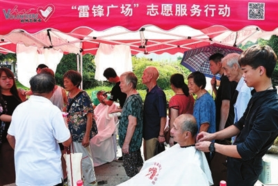 足浴行业的青年职工志愿者,顶着酷热为退休老人细致地洗脚、精心地修脚、贴心地按摩;电器修理行业的职工志愿者,义务为大家修理各种各样、各个年代的家用电器,医务工作者为大家测血压、进行夏季保健常识辅导……