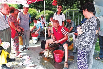 今年80岁的冯正兴老人,摆的是修、磨刀剪的“摊位”,围着他修磨刀剪的人很多,一位大妈在一旁一直不停地为冯师傅扇风。冯师傅是杭州拱墅区董家新村社区的名人,从张小泉剪刀厂退休后,就自费购置了修、磨刀剪所需要的工具,为居民义务修磨刀剪,几十年来,风雨无阻,深受社区居民欢迎。他也先后获得杭州市学雷锋标兵,拱墅区道德模范等荣誉。