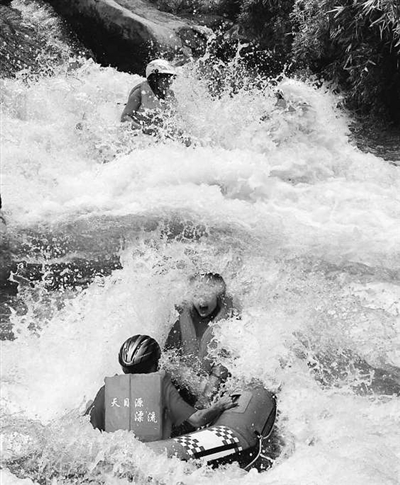 一阵阵的欢呼声,早就溢出了深潭,惊忧了山魂。天目溪成了欢乐谷,每一个游客都忘记了别人的存在,而自己才是快乐的主角。“打!打!打!”的厮杀声一浪高过一浪,幸福的惨叫声洒满了山谷。原来,皮筏上的很多人早就配置了水炮、水枪,真是有备而来。这是漂流中的即兴节目,用来攻击沿途相遇的漂流筏。