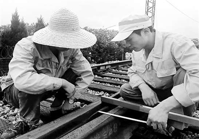 | 方焌畅(右)在师傅指导下检查道岔几何状态。 |