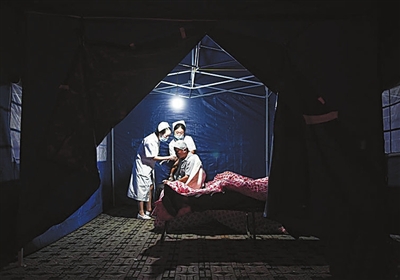 | 8月9日凌晨5点,九寨沟县人民医院护士在搭建的帐篷里为伤员打破伤风针。 8月8日,四川省九寨沟县发生7.0级地震后,九寨沟县人民医院承担了大部分伤员的医治工作,目前已收治伤员超百人,并在医院空地搭建帐篷接收避险群众。新华社记者刘坤 摄 |