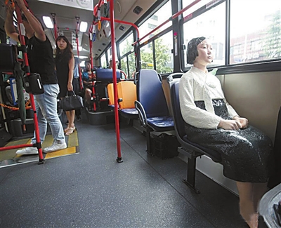 8月14日,在韩国首尔,人们乘坐载有“慰安妇”少女像的151路公交车。