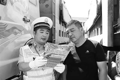 图为该大队民警正在一工程队向工程车司机开展宣传。