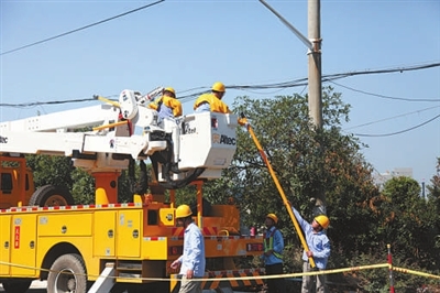 这时,温度已上升到38摄氏度,两名带电作业人员在长袖的工作服外穿上一层橡胶绝缘披肩,再戴上绝缘手套和安全帽,“全副武装”的包裹下,站在绝缘斗臂的车上升向高空,与太阳更贴近地接触。