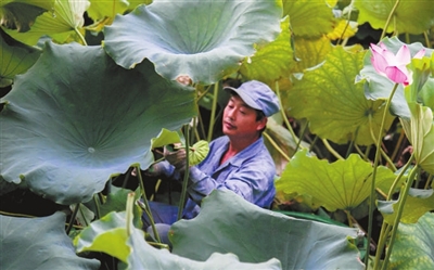 等差不多4月下旬荷叶开始冒尖,就必须“牢牢管住”——这比管小孩还要紧张,因为担心草食性鱼类来吃荷叶……这些养护荷花的门道,陈来弟早就熟记于心了。