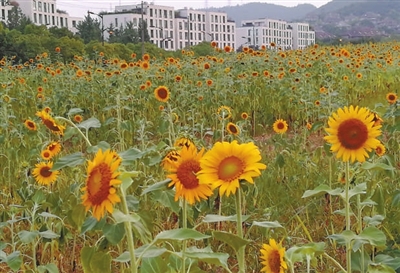 这几天,杭州古墩路玉鸟路口,一大片向日葵迎着烈日美丽盛开,为“钢筋水泥”筑成的城市,平添了一份野趣。每逢双休日,有许多爱好摄影的职工前来拍摄创作,也有不少家长带着孩子来赏花游玩。