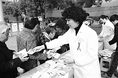 图为叶小红正在给市民分发防治艾滋病宣传材料。
