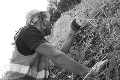 连日来,在永康市农村公路前仓镇荆州至历山公路,即8km+770m处的边坡治理施工现场,永康市公路管理部门的施工人员头顶烈日正在抓紧施工。该路段的边坡治理工程将在8月底前完工。图为施工人员对易滑坡的边坡,采用SNS柔性防护网进行防护。林加强 丰慧莹 摄