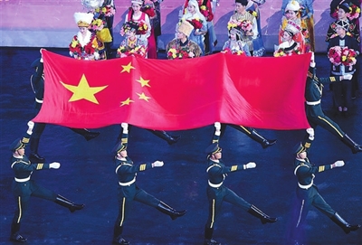 | 8月27日,旗手护送中华人民共和国国旗入场。当日,中华人民共和国第十三届运动会开幕式在天津举行。 新华社记者杨宗友 摄 |