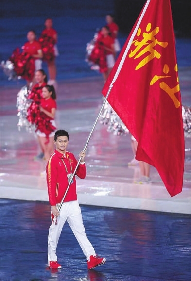 | 8月27日,浙江体育代表团旗手孙杨在入场仪式上。当日,中华人民共和国第十三届运动会开幕式在天津举行。 新华社记者费茂华 摄 |