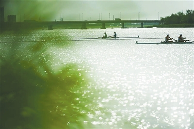 8月29日,参赛选手从海河河面挥桨划过。当日,第十三届全运会赛艇项目在天津市海河吉兆桥段继续进行。阳光下的海河河面波光粼粼,星光璀璨,参赛选手在海河上挥桨划过,仿佛在星际穿行。