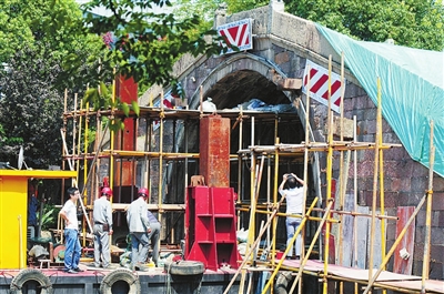 9月4日,杭州上塘河上的百年古桥欢喜永宁桥,开始进行施工修复。7月6日凌晨4点多钟,始建于清代的欢喜永宁桥东北侧桥体发生坍塌,当时,因多日暴雨导致桥梁金刚墙内填土吸水膨胀,东北侧金刚墙部分倒塌,带动部分拱券和桥面松动垮塌。