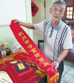 按约定时间再次上门,终于见到冯大伯了。冯大伯很健康,看不出有80岁的年纪,浑身透着一股老工人特有的朴实、耿直、正派的气息。说到志愿服务,大伯不无自豪地拿出了杭州市学雷锋标兵、杭州市功勋志愿者、拱墅区道德模范等荣誉证书、勋章、奖章和绶带,满满的一桌。他还指着卧室里的一台液晶彩电说,这是2014年浙江省人民政府奖励给他的,杭州市仅有2位志愿者获此殊荣,他是其中一位。有一年,当时的杭州市长邵占维来小区视察社区工作,还指名要见他,见面就夸他。