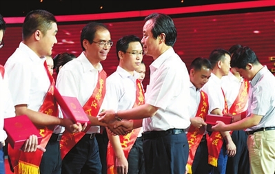 | 吴国林等10人代表100名“最美工匠”站上了领奖台。 记者周金友 摄 |