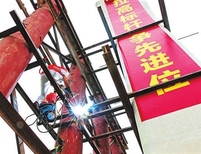 近日,在台州市域铁路S1线一期工程洪家特大桥建设工地上,中铁电气化局台州项目部支架安装班组的工人,在10米高的洪家特大桥桥墩支架上进行焊接作业。自工程开工以来,建设者们积极投身“建设美丽浙江、创造美好生活”为主题的“两美”浙江立功竞赛活动,战高温,冒酷暑,仅用一个多月时间,出色地完成了洪家特大桥首榀简支梁、连续梁0号块的支架安装任务。