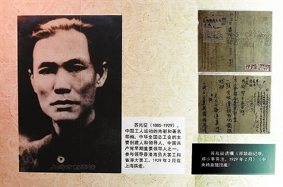 在这些珍贵的历史资料中,记者第一次看见了中国工人运动的先驱和著名领袖,中华全国总工会的主要创建人和领导人,中国共产党早期重要领导人之一的苏兆征(1885~1929)的照片和亲笔遗嘱(图②,邓颖超记录,邓小平旁注,中央档案馆馆藏)。