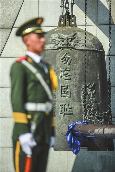 9月18日拍摄的勿忘“九一八”撞钟鸣警仪式现场。当日是“九一八”事变86周年纪念日。勿忘“九一八”撞钟鸣警仪式在辽宁省沈阳市“九一八”历史博物馆残历碑广场举行。 新华社记者潘昱龙 摄