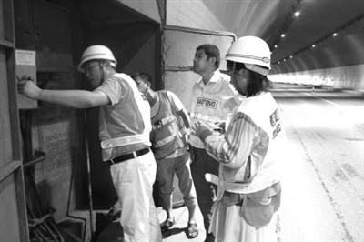 国庆长假临近,为确保桥梁、隧道安全通行。连日来,龙游县公路管理局组织养护科、安全科人员,对境内桥梁、隧道安全隐患进行全面排查,同时对桥梁伸缩缝、桥头跳车等安全隐患及时进行了处置。图为公路局安全科工作人员正在对222省道溪田隧道电器照明消防设施进行检查。胡跃文 郑艺宏