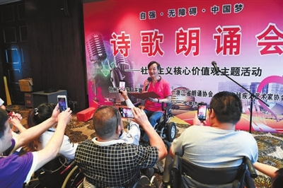 近日,杭州市残疾人无障碍环境促进会、浙江省朗诵协会、杭州市残疾人艺术家协会携手举办了一场喜迎党的十九大,践行社会主义核心价值观诗歌朗诵会,肢残人张华、胡雄华、欧阳胜等坐着轮椅走上演讲台,声情并茂地朗诵了一首首赞美党、歌唱祖国、放飞中国梦的诗歌,尽情地表达了残疾人的心声。杭州市残联爱心大使刘忠虎等也上台朗诵,与残疾人共同迎庆即将召开的党的十九大。