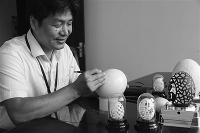 绍兴柯桥恒通水务建设有限公司职工金伟勇业余生活中一直醉心“蛋壳雕画”,他的蛋雕作品涉及的都是中国传统文化元素,包括人物、花鸟、山水以及古物图案花纹等。