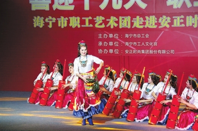 为迎接党的十九大召开,丰富基层职工群众的精神文化需求,日前,海宁市总工会启动了“喜迎十九大·职工心向党”基层巡演活动,组织海宁市总工会职工艺术团走进企业、村(社区)、重点工程建设现场等地,为广大职工群众送上10台工会特色的“文化大餐”。图为工会职工艺术团首站走进浙江交工杭海城铁项目现场慰问演出。