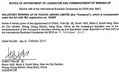 | 公司清算及清算人员任命通知 根据2016年国际商业公司法案第286条(法案) PACIFIC AWARD LIMITED自愿清盘,在国际公司注册法案下的注册号是152997,任命陈一帆(地址:中国杭州市上城区万安城市花园南苑2幢1402室)为公司的清算员,根据国际商业公司法案第17条第2款的规定,从2017年10月6日起启动公司的清盘和解散。 |