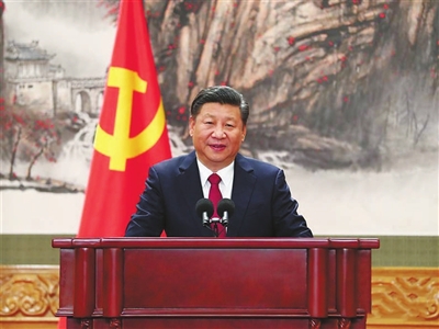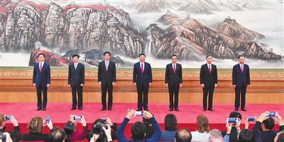 | 10月25日,刚刚在中共十九届一中全会上当选的中共中央总书记习近平和中央政治局常委李克强、栗战书、汪洋、王沪宁、赵乐际、韩正在北京人民大会堂同采访十九大的中外记者见面。习近平总书记发表讲话。新华社 发 |