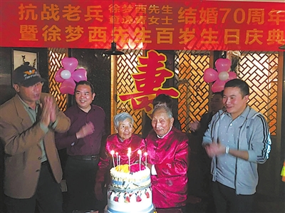 本报讯 记者孟万成摄影报道 日前,徐梦西、查逸青结婚70周年庆典在淳安举行。徐老是一位抗战老兵,当天也是他的百岁生日,而其夫人曾是南京名门闺秀。1947年元旦,国民政府在总统府举行集体婚礼,徐老作为青年军官也参加了,当时宋庆龄为证婚人,至今他俩已携手走过整整70年。