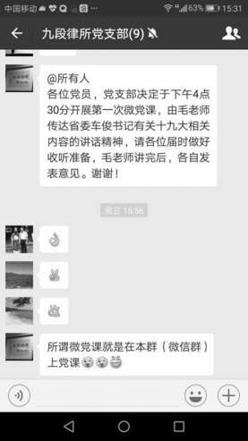那天,开课前,党支部书记毛利忠在党支部群里打了招呼,召集全体党员在下午4点半集中打开手机,聆听微党课。4点半一到,在毛利忠书记主持下,该所顾问毛建一正式开讲第一堂微党课。该课主题是学习十九大精神,传达省委书记车俊的讲话,勉励党员律师继续为法治建设尽心尽力。