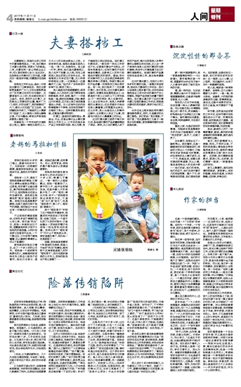 我现在工作的企业,是由一对老年夫妻任门卫兼保洁员。男的主要职责是看护厂大门,女的主要职责是对厂区环境卫生的打扫与维护。夫妻俩每天24小时,吃住都在那间门卫室内。有时,男的外出办事了,女的就马上顶替他的位置,看护厂大门;有时,女的生病了,男的就锁好厂大门,替女人打扫起厂区卫生来。有时睡到后半夜了,下晚班的工人需要开门回家了,女人看男人在那头睡得正香,不忍叫醒他,便悄无声息地起床替男人值起了班……
