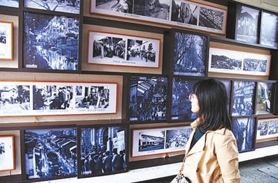 11月9日,在杭州南宋御街上,一些用镜框装裱好的杭州老照片被布置在墙上,吸引了许多游客和市民的观赏。连国庆 摄