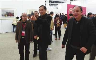 | 倪健民(前排左二)、周小兵(前排左一)等观看优秀作品展。 |