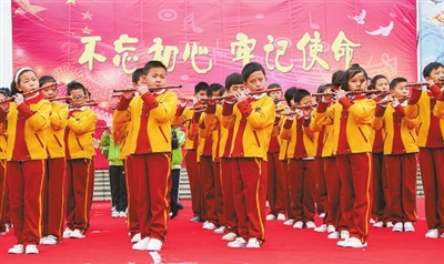 11月19日,衢州市在市民广场举行《千支竹笛奏响中国梦》大型广场演奏会。演奏会演出了千人笛子齐奏《我是共产主义接班人》《把一切献给党》等曲目,表达对党的热爱,对祖国的赞美,对人民的歌颂。图为小学生方队参加千支笛子齐奏《我的祖国》。胡江丰 摄