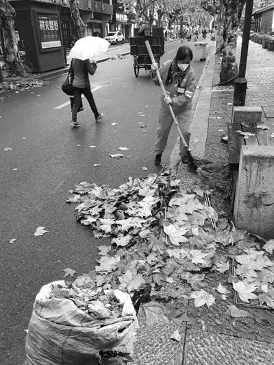 入冬后的杭城,每逢雨天,都会留下满地枯叶,许多人看见了都会情不自禁地拿起手机拍照,然后发个朋友圈,分享冬日特有的风景。不过,沾着“雨露”的落叶虽美,但自行车轮和行人经过却容易滑倒受伤,所以环卫工人每逢雨天都会早早地起床上街清扫。日前,在杭州中山南路上清扫落叶的环卫工人吴师傅说,“清扫雨天的落叶很累、很辛苦的,我们这样做也是为安全。可总有些人不问情由就埋怨我们,还有人‘骂’我们是吃饱了没事干……我们不求尊重,但望大家能理解。”毕竟,安全比“好看”重要!记者周金友 摄影报道