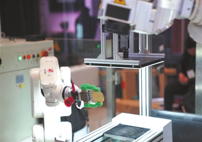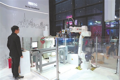 在中国移动展区的一侧,一大一小两个工业机器人正在进行激光刻画工作。明年是狗年,记者在iPad上写了一个“狗”字,小的工业机器人就把印章“拿”起来,大的机器人把印章翻了个面,激光红点对准印章,几秒后,刻着“狗”字的印章就送到了记者面前。据悉,这个机器人的两个机械手的协作,主要是通过5G网络传递信息实现的,5G低时延、高可靠的特性,可以实现机器之间的快速协作,为未来“智能制造”的发展提供了广泛的可能。