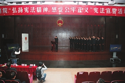 本报讯 记者胡翀 通讯员高媛萱报道 昨天是第四个国家宪法日,浙江全省法院集中开展宪法宣誓活动,各地根据实际还举行了不同形式的公众开放日活动。
