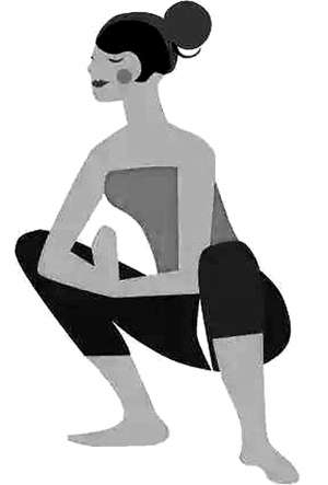 做蹲姿时,双脚与肩同宽,尽量脚跟贴地。双手合十,双手肘抵住大腿膝盖内侧,背挺直,尽量打开胸口。停留7~10个呼吸,最后以婴儿式休息。若没有瑜伽垫,也可直立休息。